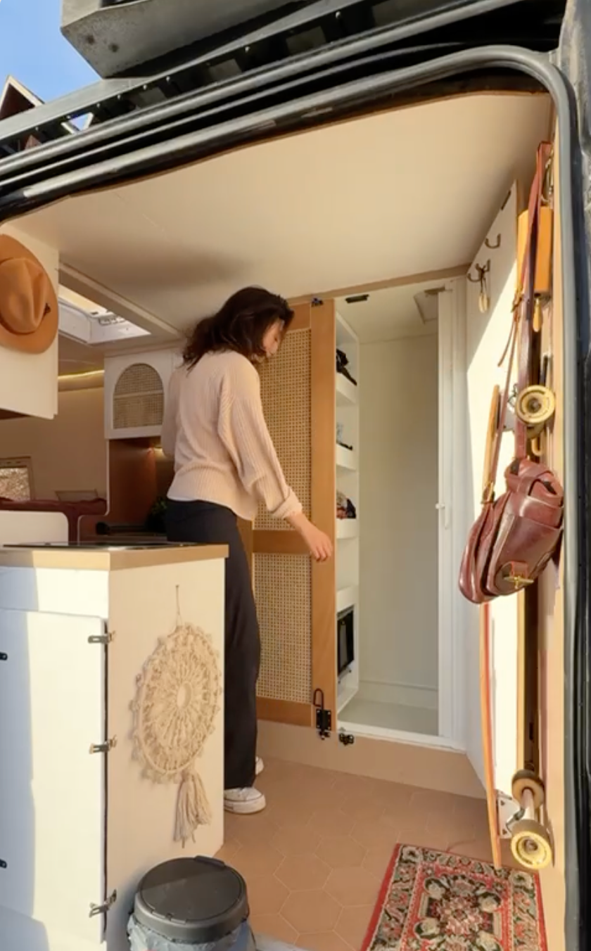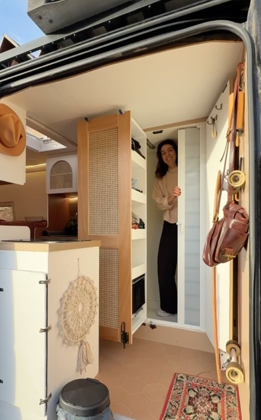 Transforme la douche de ton van en un espace double fonction : un dressing coulissant + une vraie douche spacieuse, ventilée et durable.